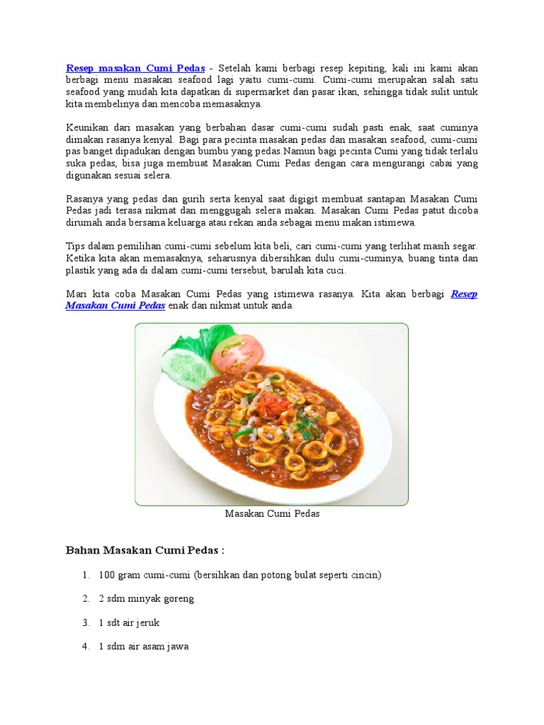 Resep masakan cumi pedas setelah kami berbagi resep kepiting kali ini kami akan berbagi menu masakan seafood lagi yaitu cumi cumicumi cumi merupakan salah satu seafood yang mudah kita dapatkan di supermarket dan pasar ikan sehingga tidak sulit untuk kita membelinya dan mencoba memasaknya. Resep masakan cumi basah sajian cumi adalah sajian yang nikmat dan enak. Lihat juga resep sambel cumi asin pedas enak lainnya.